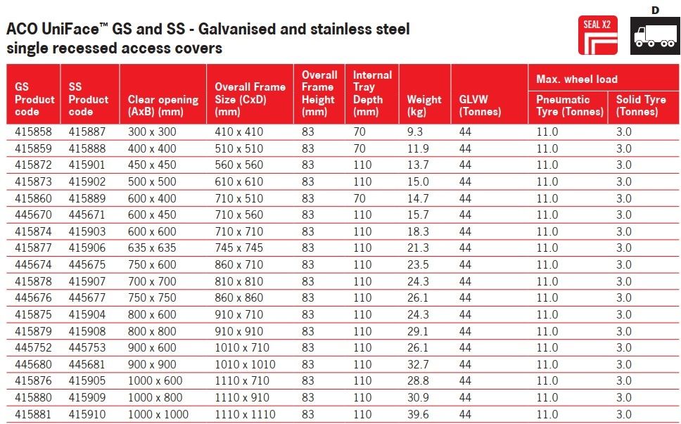 The ACO UniFace Stainless Steel Recessed Access Cover is a double sealed and clear opening cover made from corrosion resistant 304 stainless steel. Comes with a 50mm overall depth as standard and available in a range of sizes.