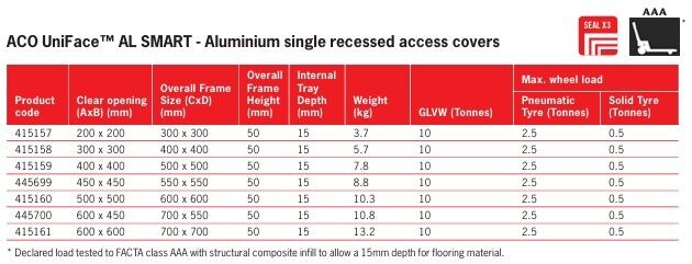 UniFace AL SMART 200x200mm clear opening aluminium recessed cover triple sealed overall frame size 300x300x50mm FACTA AAA