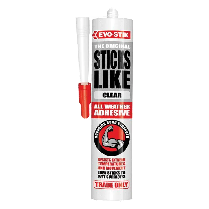 EVO-STIK Sticks Like Sh*t Adhesive Clear is a high performance, one component, moisture curing adhesive that offers excellent initial grab and a high strength bond. Formulated with advanced hybrid polymer technology, it delivers exceptional strength, instant grab, and long-lasting durability across a huge range of materials.