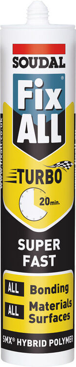 Soudal Fix ALL Turbo is a high-quality single component super fast curing adhesive with exceptional final bond strength. Based on SMX Polymer Technology, Turbo has rapid strength build-up after 20 minutes with final bond strength achieved in 3 hours.