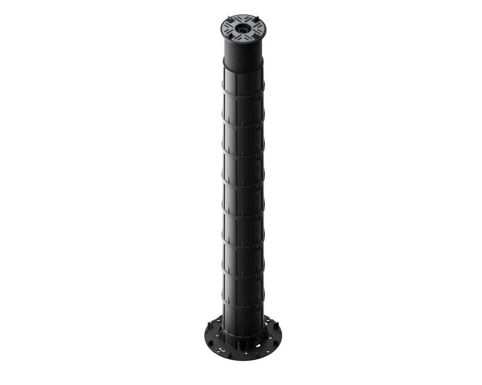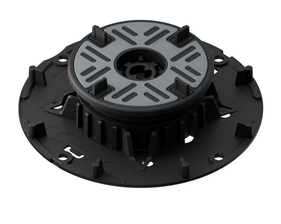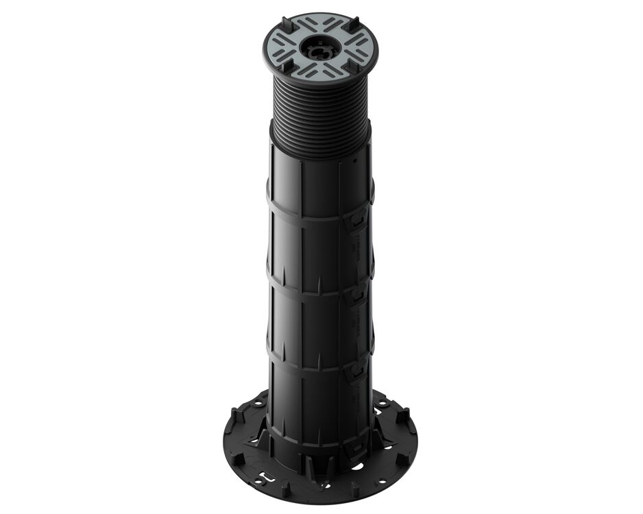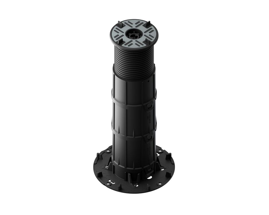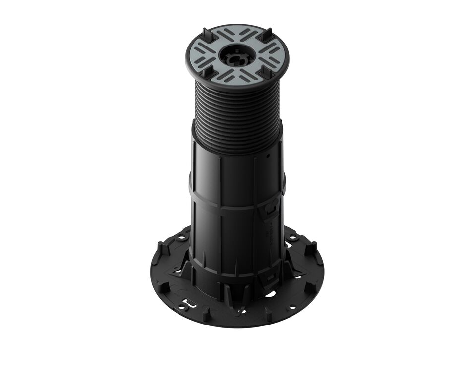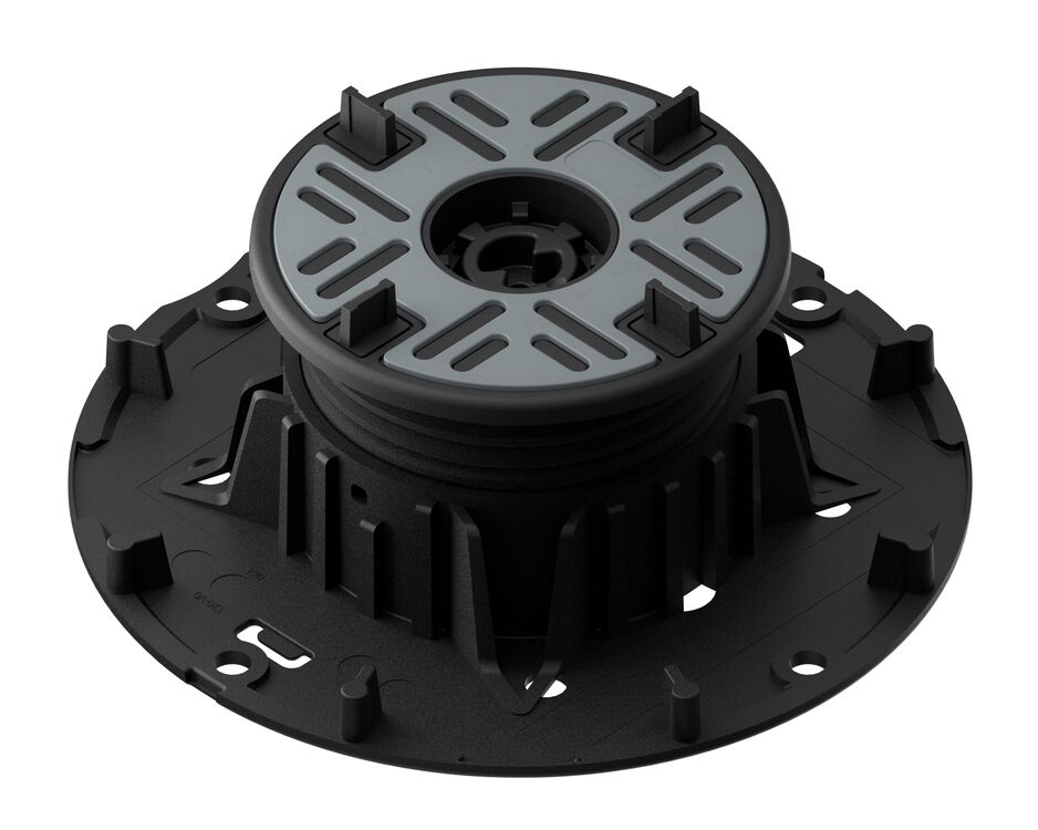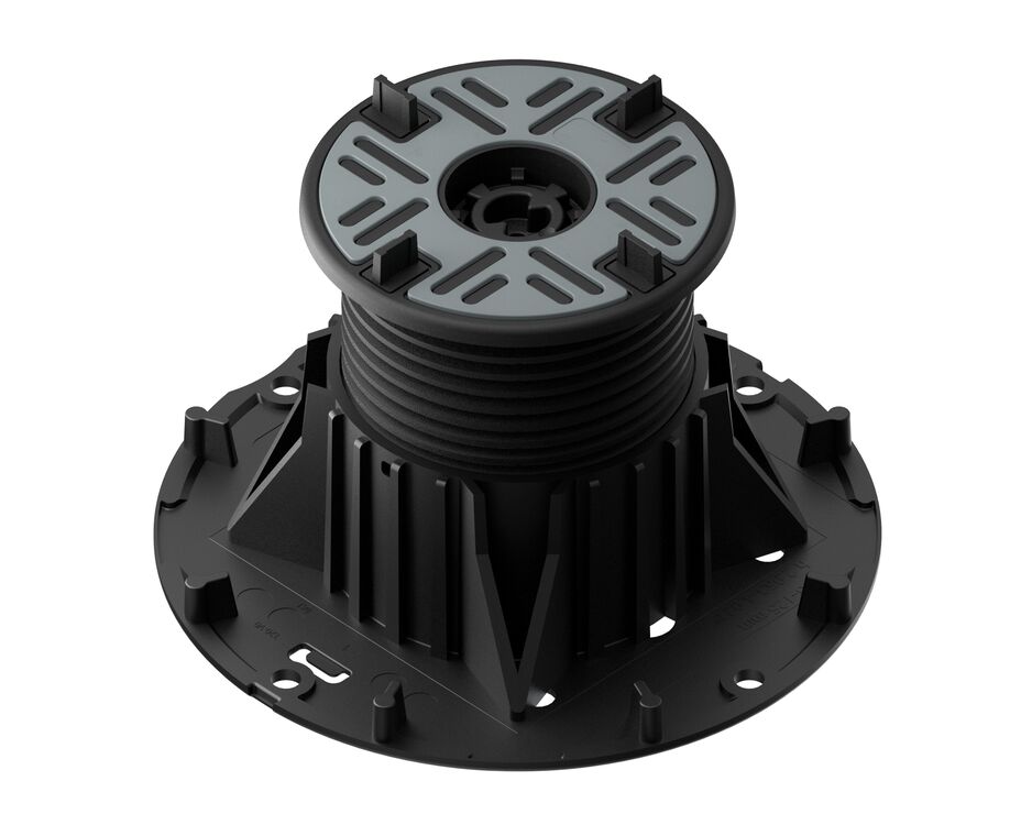 Able to tolerate over 3 tonnes in weight per unit, the headpiece of this pedestal is self-levelling as standard but, by using the “grey nut”, the head can be locked rigid within the same unit. The telescopic thread gives a large height range per unit; simply twist the stem to adjust the height of the unit, which can be achieved with slab / tile or decking joist still in place. This is a suspended system so the weight of the paving slabs / tiles ballast themselves.
