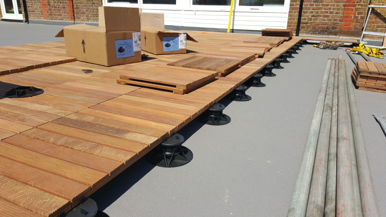 The pedestals are placed on a flat, hard surface, with no mechanical fixings required. They need to be placed on a structured surface, and shouldn't be placed on non-compacted earth.