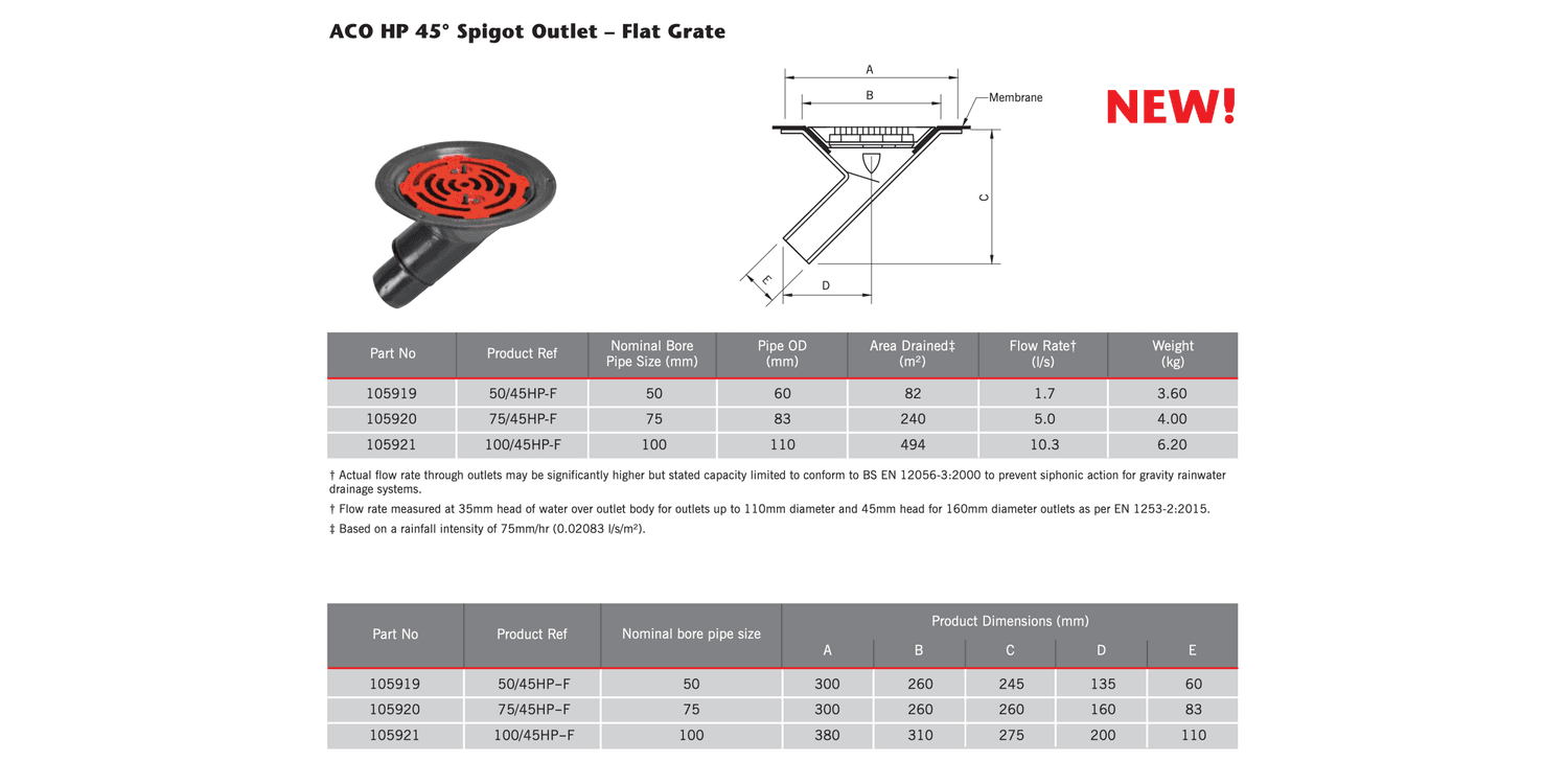 The ACO 45° Degree Spigot Aluminium Roof Drainage Outlet with flat grate is a durable, high performance and effective flat roof rainwater drainage solution that's made from a high quality die-cast LM6 aluminium silicon alloy. Easy to install, this angled rainwater drainage outlet is capable of handling high flow rates to reduce the number of outlets required for your latest project.