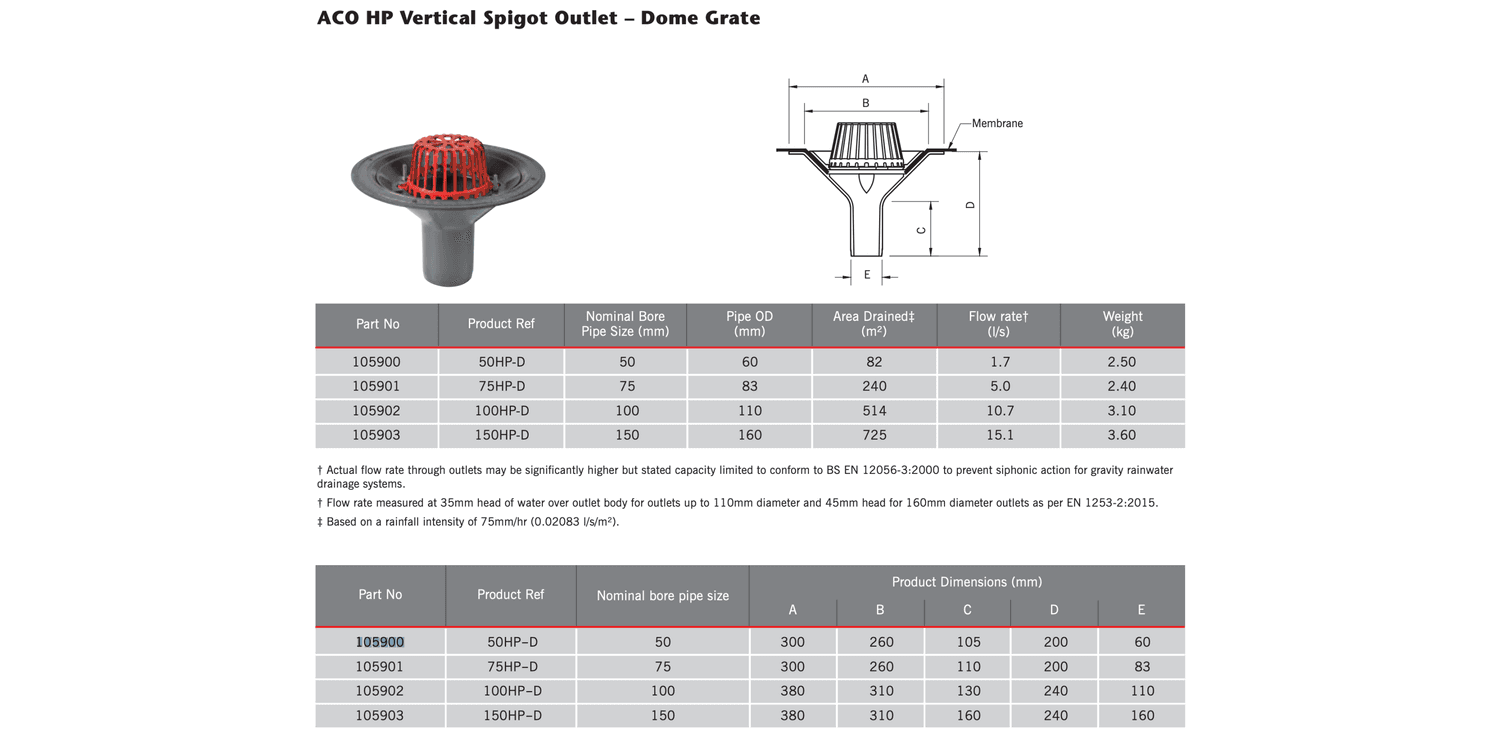 The ACO Vertical Spigot Aluminium Roof Drainage Outlet with dome grate is a durable, high performance and effective flat roof rainwater drainage solution that's made from a high quality die-cast LM6 aluminium silicon alloy. Easy to install, this efficient rainwater drainage outlet is capable of handling high flow rates to reduce the number of outlets required for your latest project.