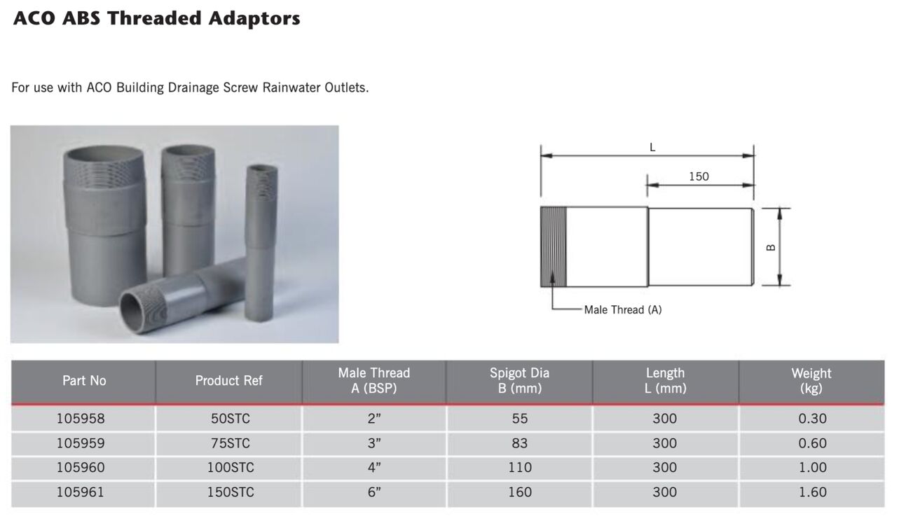 The ACO ABS Threaded Adaptors are for use with the ACO Screw Rainwater Outlets. The adaptors are assembled using PTFE tape to ensure a watertight connection. Manufactured from tough ABS, the adaptors are supplied with a male thread and chamfered spigot for easy connection to PVC-U, socketless cast iron and aluminium rainwater pipes.
