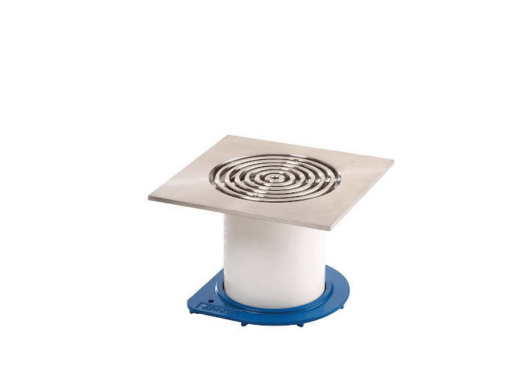 After waterproofing to the balcony outlet and the clamp ring has been fastened down, an adaptor plate is fitted to the clamp ring which allows for the insertion of a height adjustable throat complete with the square grating assembly.