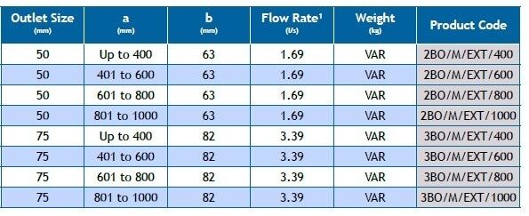 Mini two-way extended spigot outlets are suitable for direct connection to cast iron pipework to BS EN 877 and BS 416, HDPE pipework and PVC O-ring socketed pipe to BS 4514 and BS EN 1329-1.