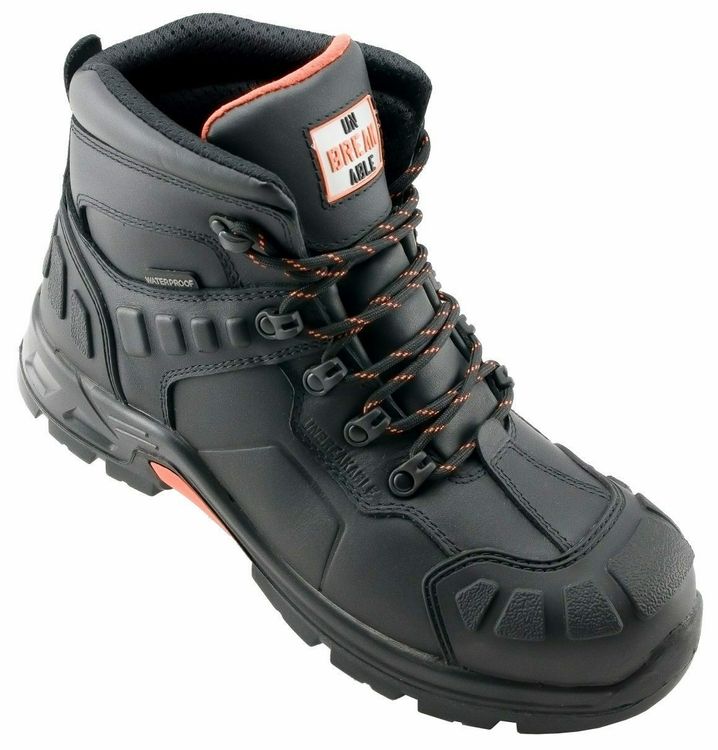 The full-grain waxy leather of the Unbreakable Waterproof Black Composite Safety Boot is durable and waterproof. The boot also has a composite toe cap and the highest SRC slide resistance. The thickly padded collar and tongue keeps you comfortable while you work. It can withstand heat up to 300 º C.