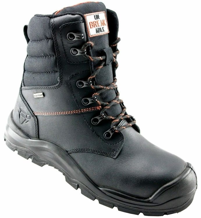 The Unbreakable Tornado S3 Src Wr Waterproof Black Zip Safety Work Boots offer superior protection and comfort for demanding work environments. It has the highest SRC slip resistance, can withstand temperatures of 200°C and has a thickly padded collar and tongue to keep you supported as you work. It is created with a black full-grain leather top. Also included is a composite toe cap to protect from any hazards.