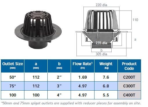 Available in 50mm, 75mm and 100mm outlet sizes. The Harmer Cast Iron Medium Sump Vertical Threaded Rainwater Drainage Outlet consists of a compact integral sump body for a vertical pipework connection in your next flat roof drainage project.