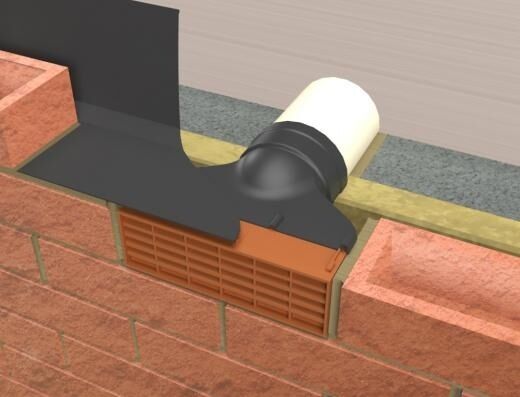 The thru...air product can be built into the brickwork as the masonry proceeds. The placement of the product is determined by the position of the internal extraction system. The product must be installed angled slightly down towards the external brickwork to allow for any condensation build up to drain out via the airbricks. The detail can then be finished off with a suitable cavity tray (including weep vents) above the product to prevent water ingress.