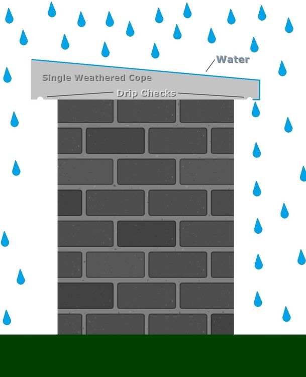 Although single weathered coping stones are designed to drain water to one side, all of our copes are manufactured with integral drip checks on both sides. Drip checks are essential for preventing rainwater from tracking back underneath the coping. By breaking the flow of water, drip checks help to reduce staining, protect mortar joints, and improve the overall durability and lifespan of the wall.
