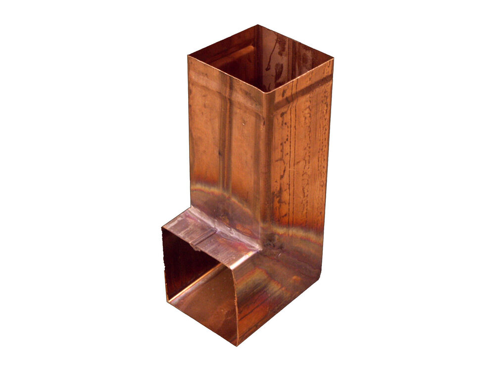 Copper 80x80mm Downpipe - Shoe (with connector) Our Round copper downpipes are manufactured from 100% natural 0.6mm copper and are supplied in 2.4m lengths, making both transportation and installation uncomplicated. Each length is swaged at one end so they push fit together, with additional connectors available so you can use up all your off cuts. All of our downpipe components are designed to be push fit and require no sealing.