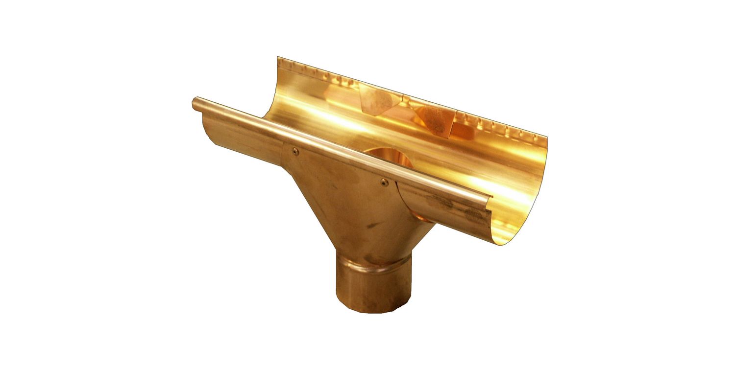 Copper Large Half Round Gutter - 100 ø Swiss Outlet 185mm x 95mm Our Half Round style copper gutter is manufactured from 100% natural 0.6mm copper and is supplied in 2.4m lengths, making both transportation and installation uncomplicated. This simple design has a folded back edge for strength and an attractive rolled front for decoration. Fitting our Half Round copper guttering couldn't be easier, sections are overlapped, jointed using silicone and copper rivets, with pre-made corners and outlets available off the shelf.