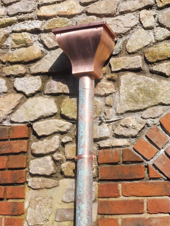 Copper Standard Half Round Running Outlet - 80ø Swiss Outlet 125mm x 70mm Our Half Round style copper gutter is manufactured from 100% natural 0.6mm copper and is supplied in 2.4m lengths, making both transportation and installation uncomplicated. This simple design has a folded back edge for strength and an attractive rolled front for decoration. Fitting our Half Round copper guttering couldn't be easier, sections are overlapped, jointed using silicone and copper rivets, with pre-made corners and outlets available off the shelf.