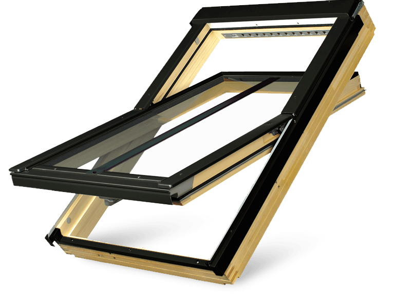 Fakro conservation windows are designed to meet planning requirements in conservation areas, with black vertical mullion bar down the middle and black cladding (RAL 9005). This FAKRO Natural Pine Conservation Centre Pivot Double Glazed Roof Window has a handle placed at the bottom, delivering ease of use and operation.