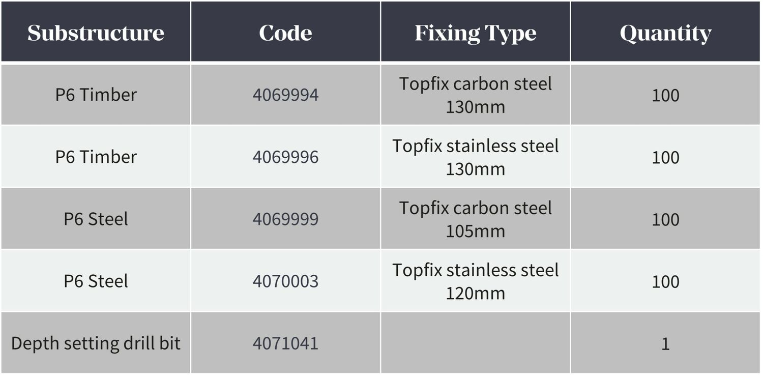 The Eternit Topfix Self-Drilling Wood and Steel Structure Fixings are suitable for both roofing and cladding installations. They feature an extra high head to ensure a better fit of the bit, the 12mm robust rubber washer (25mm dia) acts as a seal preventing water penetration and the wings open up the clearance hole in the fibre cement sheet to prevent cracking.