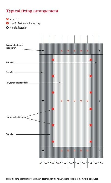 Fixing positions Polycarbonate rooflights should be fixed through every corrugation at the end lap and intermediate purlin using the same fasteners for the FarmTec sheets, apart from the side lap corrugations. Polycarbonate roofllights should be pre-drilled with an 11mm hole at all purlin fixing positions. (This is for polycarbonate sheets only and not the fibre cement sheets).