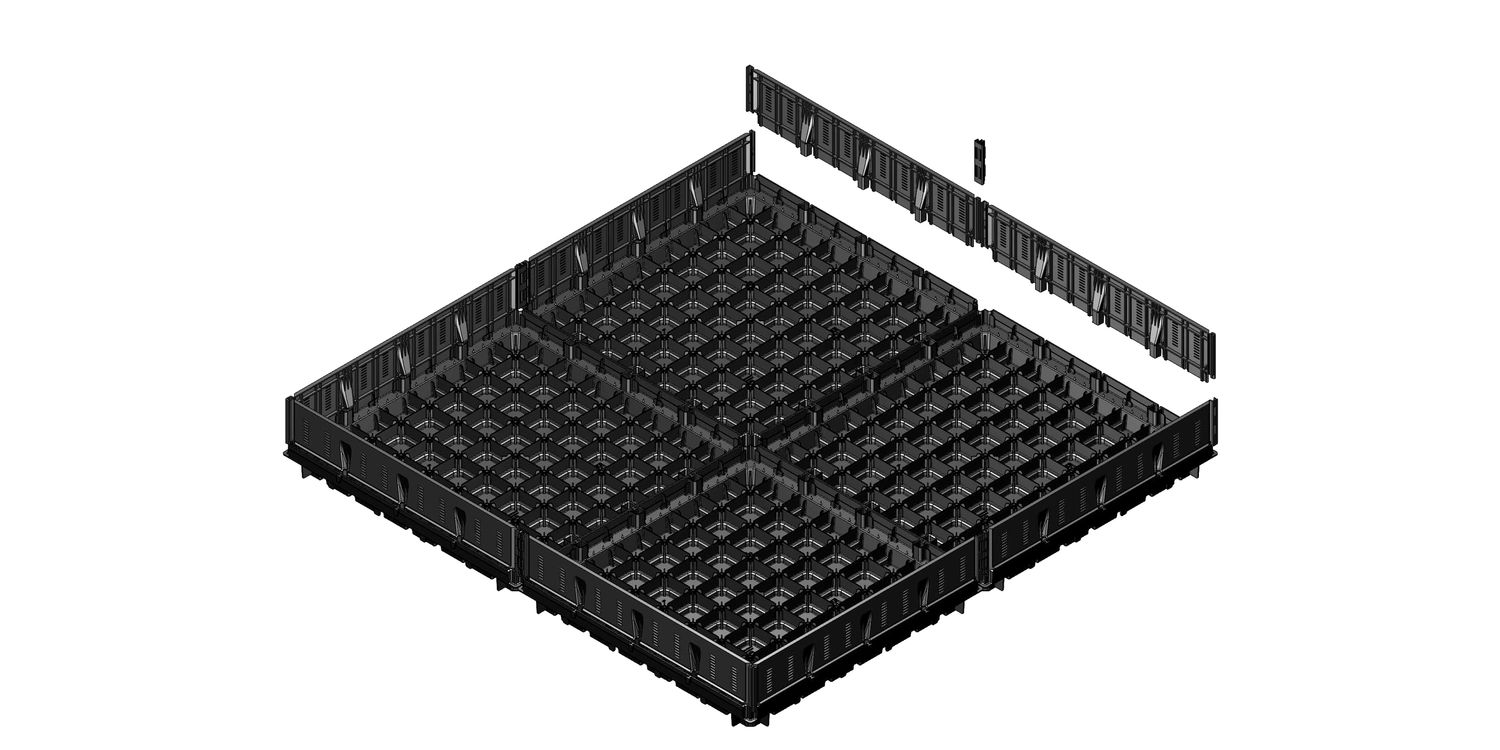 This lightweight interlocking modular roof tray can be used for a wide range of applications including active and passive blue roof applications, green / 'living' roofs, blue/green roof applications with or without passive irrigation systems and roofing systems that form part of a podium deck or green roof system.