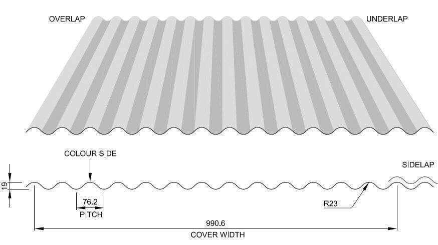 • Corrugated 14/3 profile sheet with 19mm profile height and 76mm pitch
