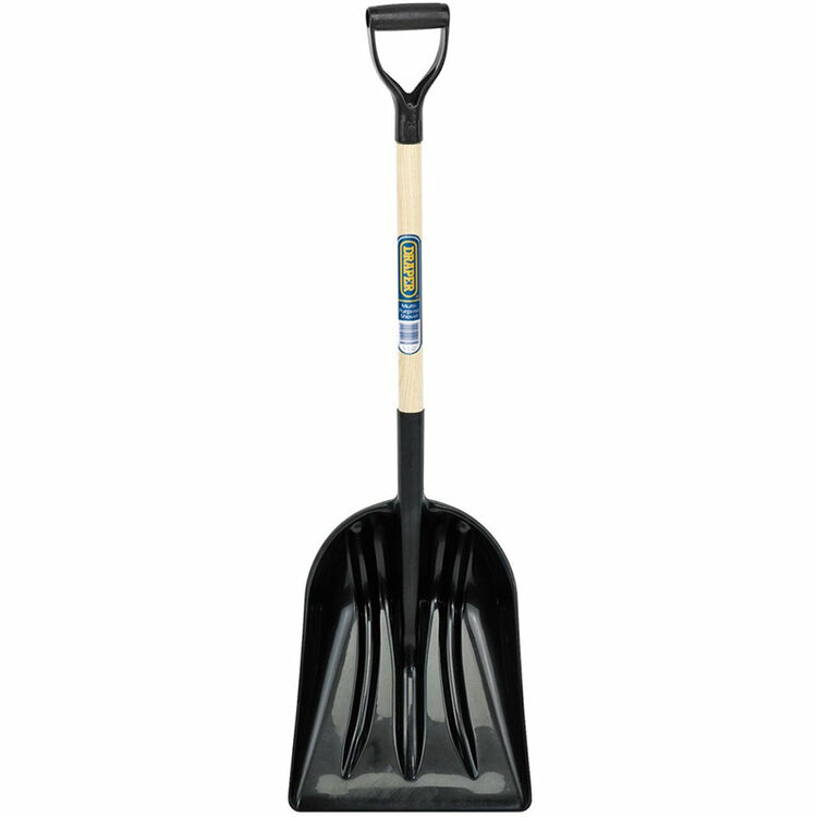 ABS tough plastic spark - free blade with hardwood shaft and moulded 'Y - dee' handle. Ideal for use with wood chips, snow, grain, stable/farm waste, compost, rubble and debris. Deep ridged blade width 360mm at the base narrowing to 170mm (approx.) at the top and 360mm (approx.) long.