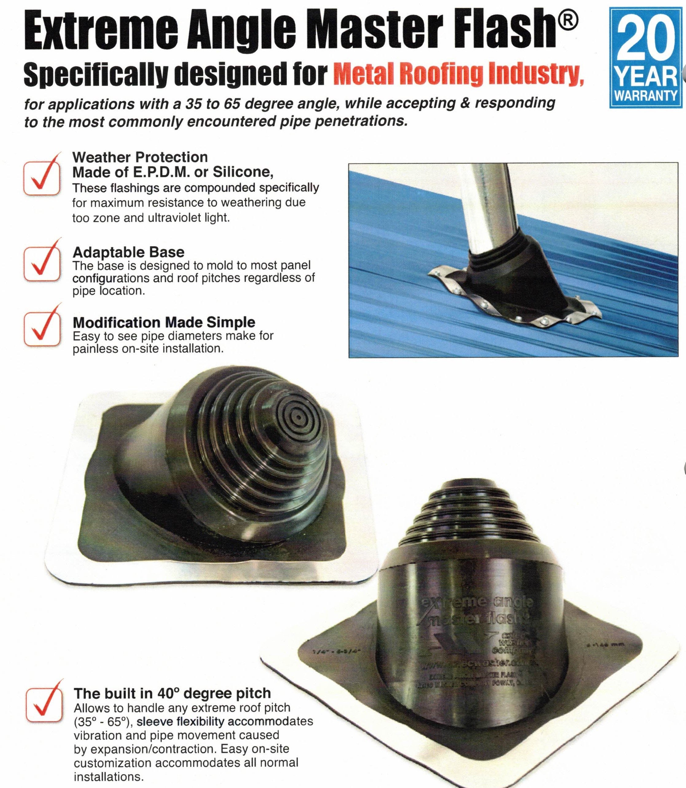 built-in 40° pitch, this flashing can handle any extreme roof pitch from 35° to 65°, as well as