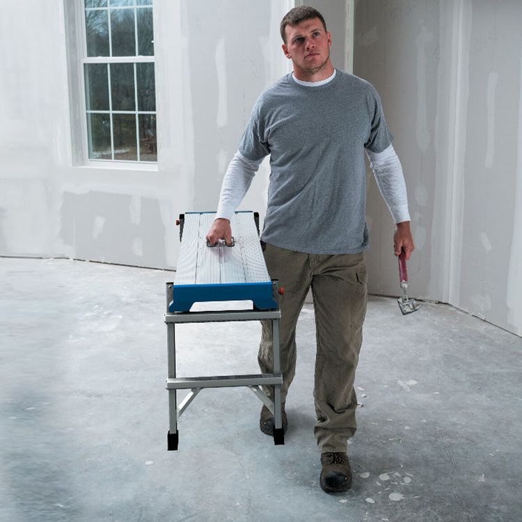Its non-slip platform offers ample space for users to work comfortably and its lightweight yet durable aluminium construction makes it easy to transport and set up, while its folding legs allow for convenient storage and portability.