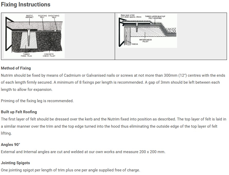 A minimum of 8 fixings per length is recommended. A gap of 3mm should be left between each length to allow for expansion. Priming of the fixing leg is recommended.