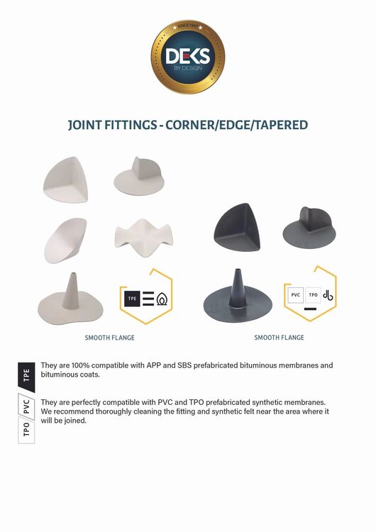 The joint features a contoured profile with gently tapered edges that allow it to wrap smoothly around external roof corners, providing a seamless transition between membranes and preventing creasing, water pooling or stress points that can lead to leaks over time. It is particularly effective in areas where waterproofing needs to be connected near cables or rooftop installations such as antennas, air conditioning units, or photovoltaic (solar) systems.