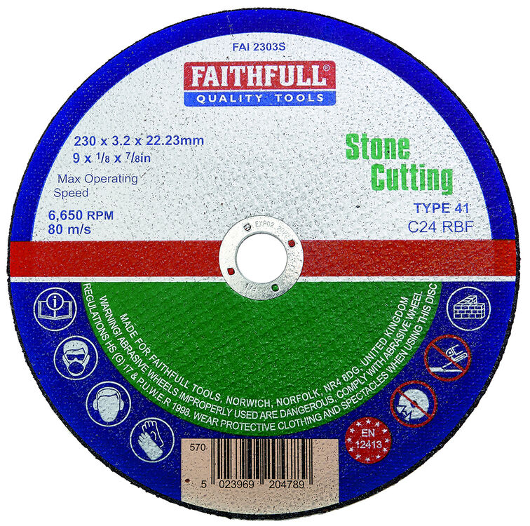 Flat Stone Cutting Discs are manufactured using Silicone Carbide abrasive grit with fibreglass reinforcing and resin bonded to provide both safety and optimum cutting performance. Stone cutting discs must never be used for grinding and must always be presented to the workpiece at an angle of 90ΒΊ. For use with a variety of machines, mini-grinders to stationary cutting-off machines.