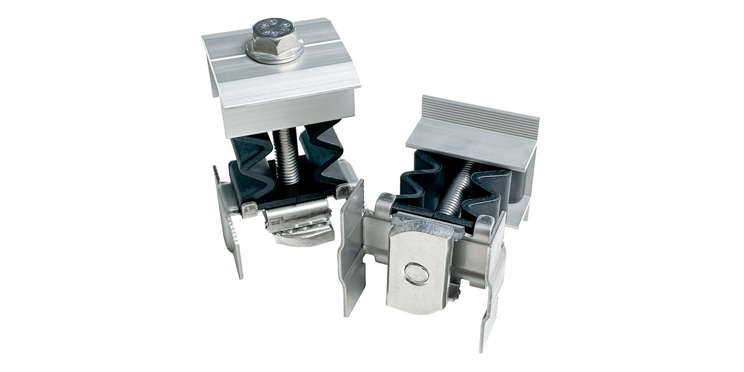 30-50mm Pre-Assembly Solar Mount Clamp. Quick pre-assembled clamp for solar panel mounting. Includes outer profile in anodised extruded aluminium plus an M8 guide nut and bridge in grade.