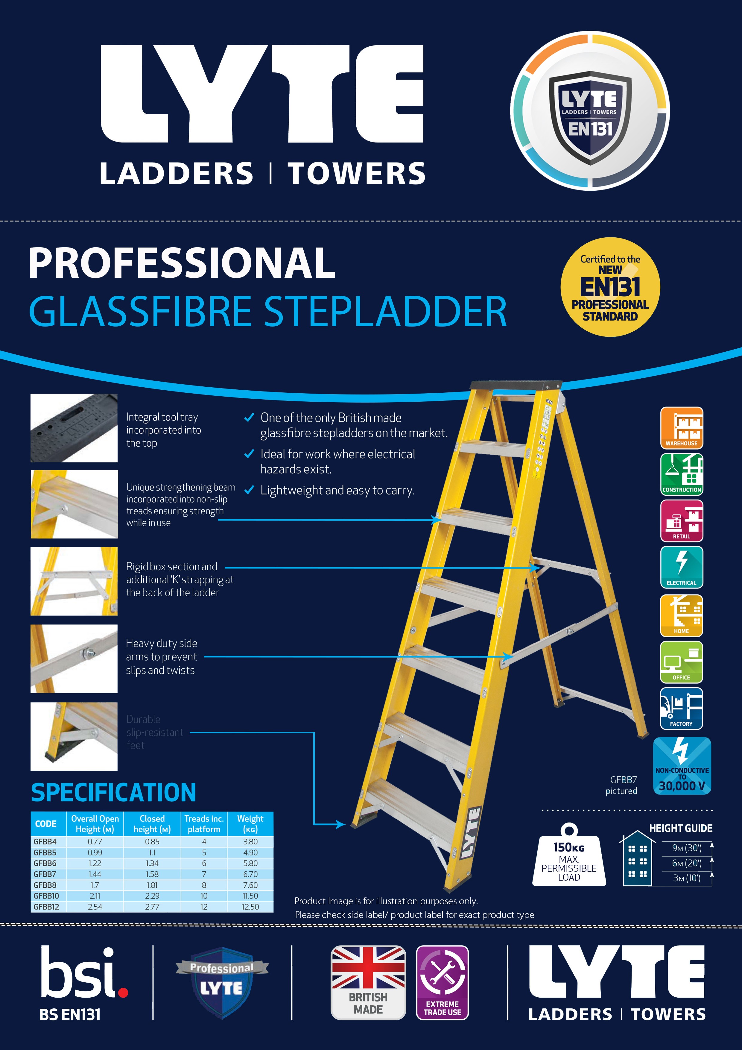 Lyte EN131-2 Professional Glassfibre Step Ladders are a firm favourite with electricians and tradesmen alike. Ideal for trade use, this ladder has been durability tested to 50,000 cycles and certified to the EN131 Professional standard. This Wide Glassfibre Step Ladder is very robust and can be folded up into a flat pack for easy storage and transportation.