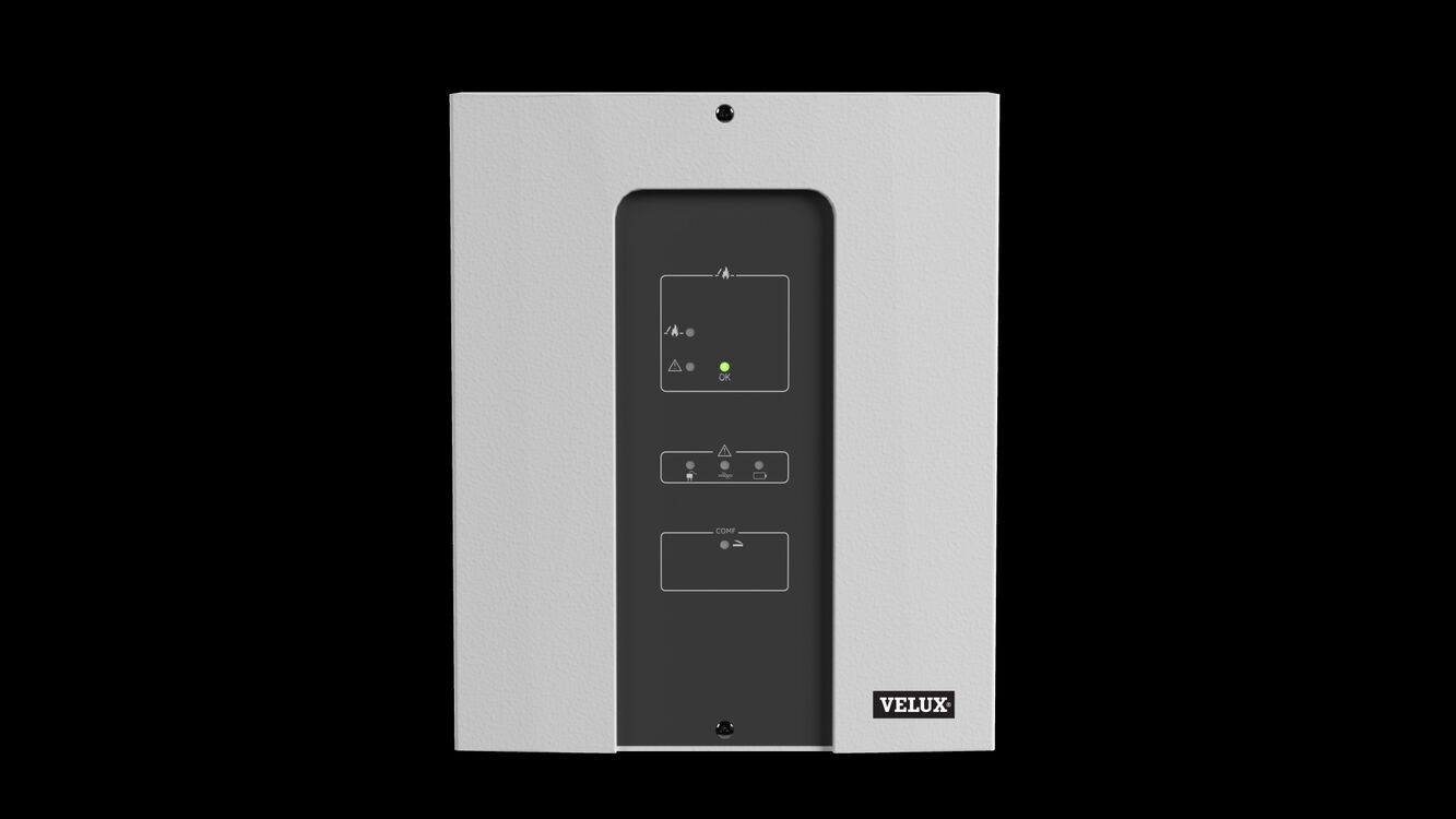 Controls up to 2 VELUX smoke ventilation windows GGL/GGU simultaneously or 1 VELUX glass roof light electric exit CXU with the control unit KFC 305.