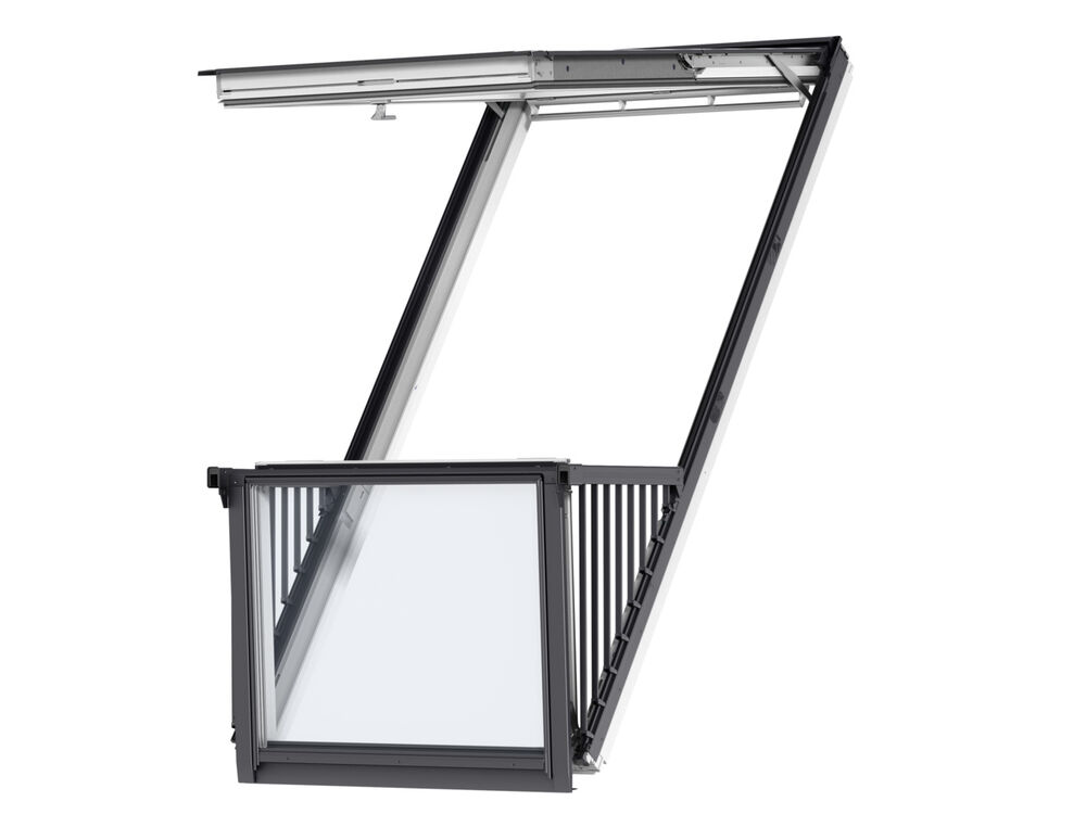 Consisting of a top-hung roof window and a bottom section that unfolds into a glazed balcony with elegant side banister railings, it’s a balcony experience like no other.