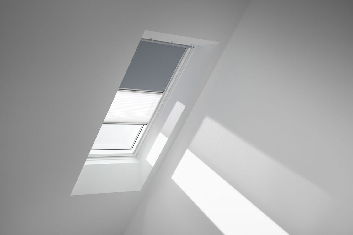 The VELUX duo blackout blind is a blackout blind and a pleated blind in one easy to use unit. It offers the best of both worlds - almost complete darkness at anytime, or softly diffused natural light all day.