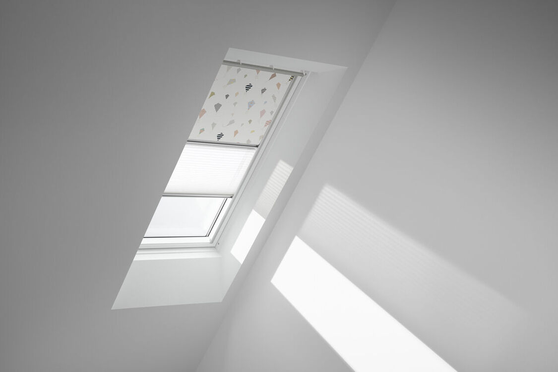 The VELUX duo blackout blind is a blackout blind and a pleated blind in one easy to use unit. It offers the best of both worlds - almost complete darkness at anytime, or softly diffused natural light all day.