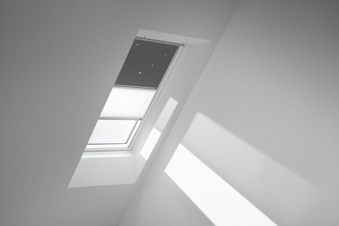 The VELUX duo blackout blind is a blackout blind and a pleated blind in one easy to use unit. It offers the best of both worlds - almost complete darkness at anytime, or softly diffused natural light all day.