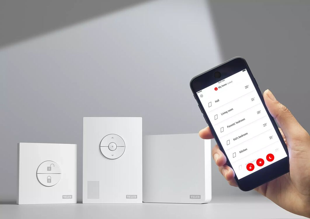 Connected to the VELUX ACTIVE app on your phone, the kit works with VELUX electric and solar roof windows, blinds and shutters, allowing you to open or close them wherever you are.