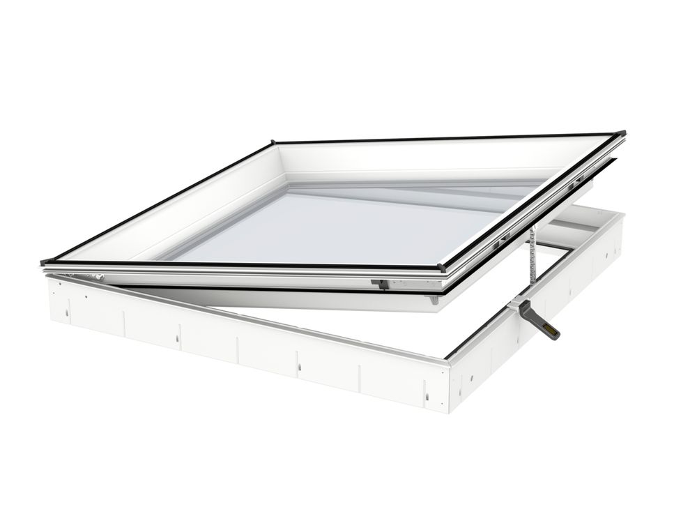 Electrically flat roof window base with double-glazed unit Moulded polyurethane frame around a plywood code for slim finish Suitable for roof pitches between 0-15° Laminated inner pane for additional safety, as standard Compatible with all VELUX ISU top covers