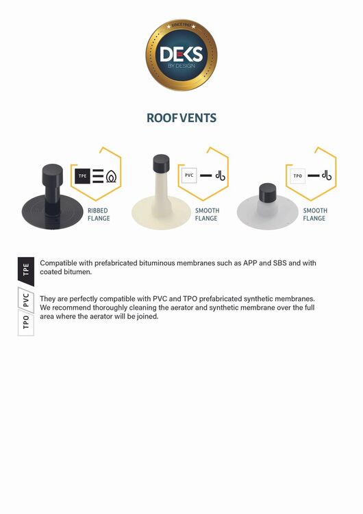 Constructed from high-grade, weather-resistant materials, the DEKS Flat Roof Vent provides exceptional durability and chemical resistance, even in extreme temperatures. Its robust mechanical properties remain stable over time for reliable performance in harsh UK conditions. The ribbed flange base ensures a secure fit, while the quick-locking cover system provides a safe, airtight installation. Together, these features make DEKS aerators the ideal solution for continuous vapour discharge and long-term roof protection.