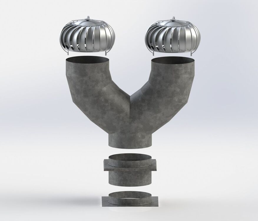 Set of 2 turbines + splitter + auxiliary electric ventilator. EVL ventilators are used to guarantee or increase the turbine’s immediate output during adverse weather conditions or poor current performance. The ventilators are not designed for continuous operation, instead they serve to intensify ventilation. Typical uses for this set are multi storey buildings (7 plus storeys). The set contains 2 of the most powerful Lomanco TEB 14" turbines made of aluminium, a splitter and an additional electric ventilator. The splitter is made of galvanized steel.