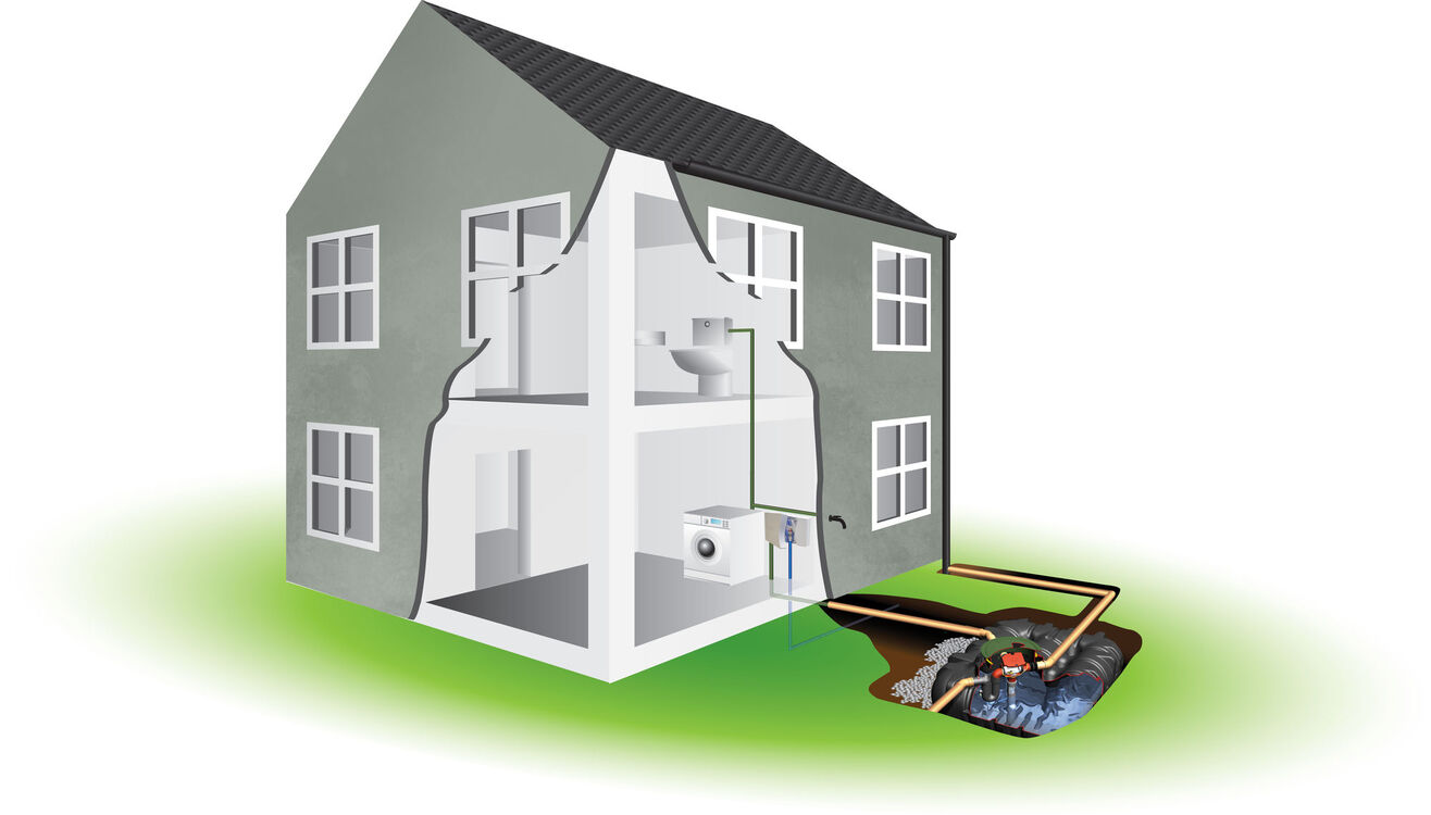 The Graf Direct-supply system is designed to support WC’s, washing machines, irrigation and outside cleaning purposes. Rainwater is collected from the roof of the property and is fed into the underground tank via the downpipes. On entry to the tank, the water passes through a filter, to prevent any debris from going into the tank. With this system, there is a mains water top-up unit located within the property.